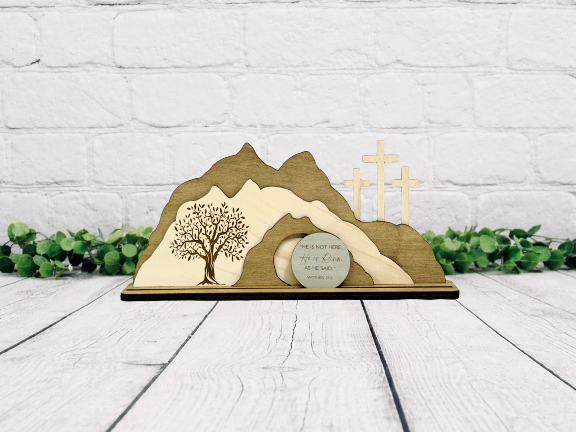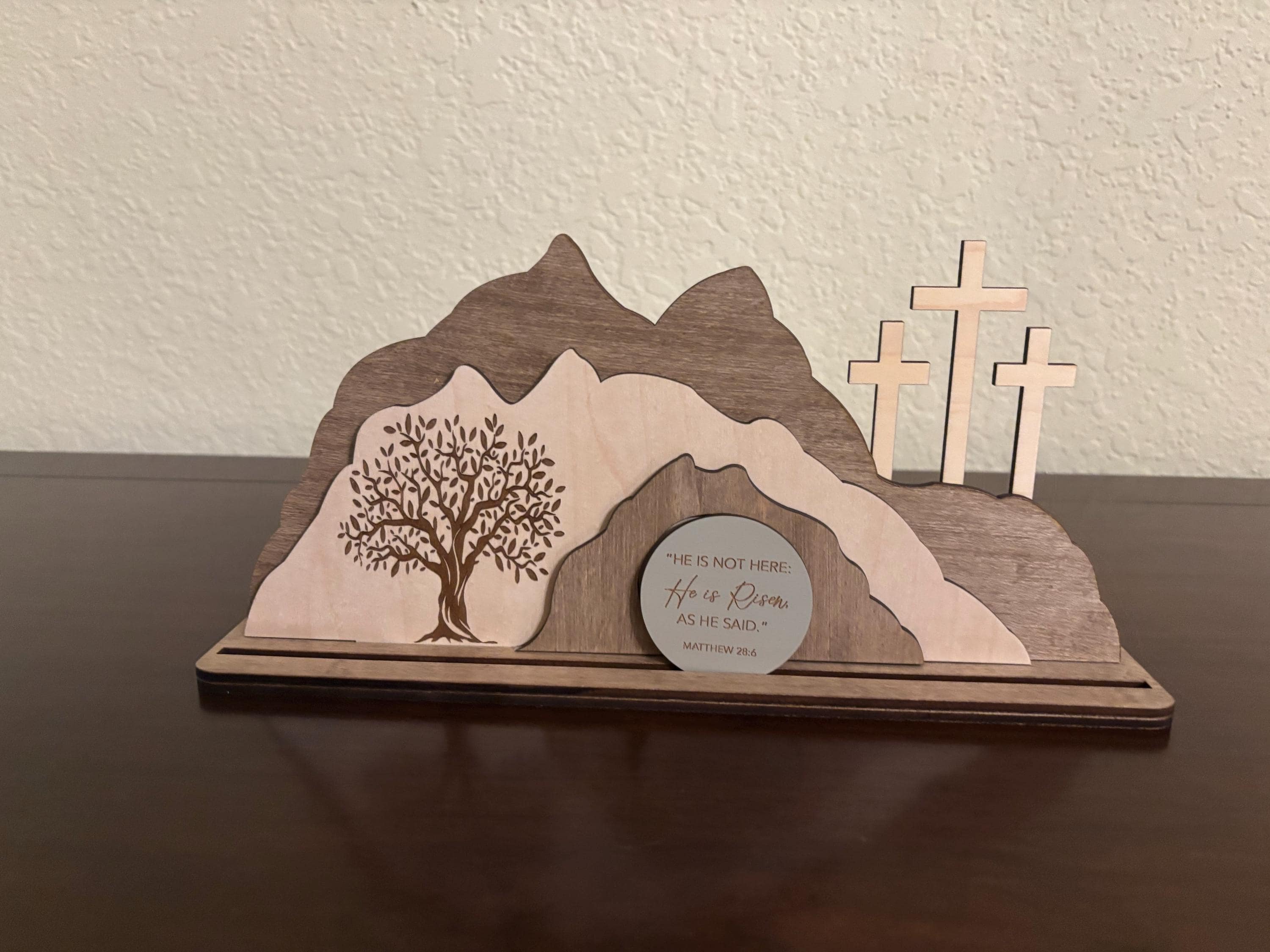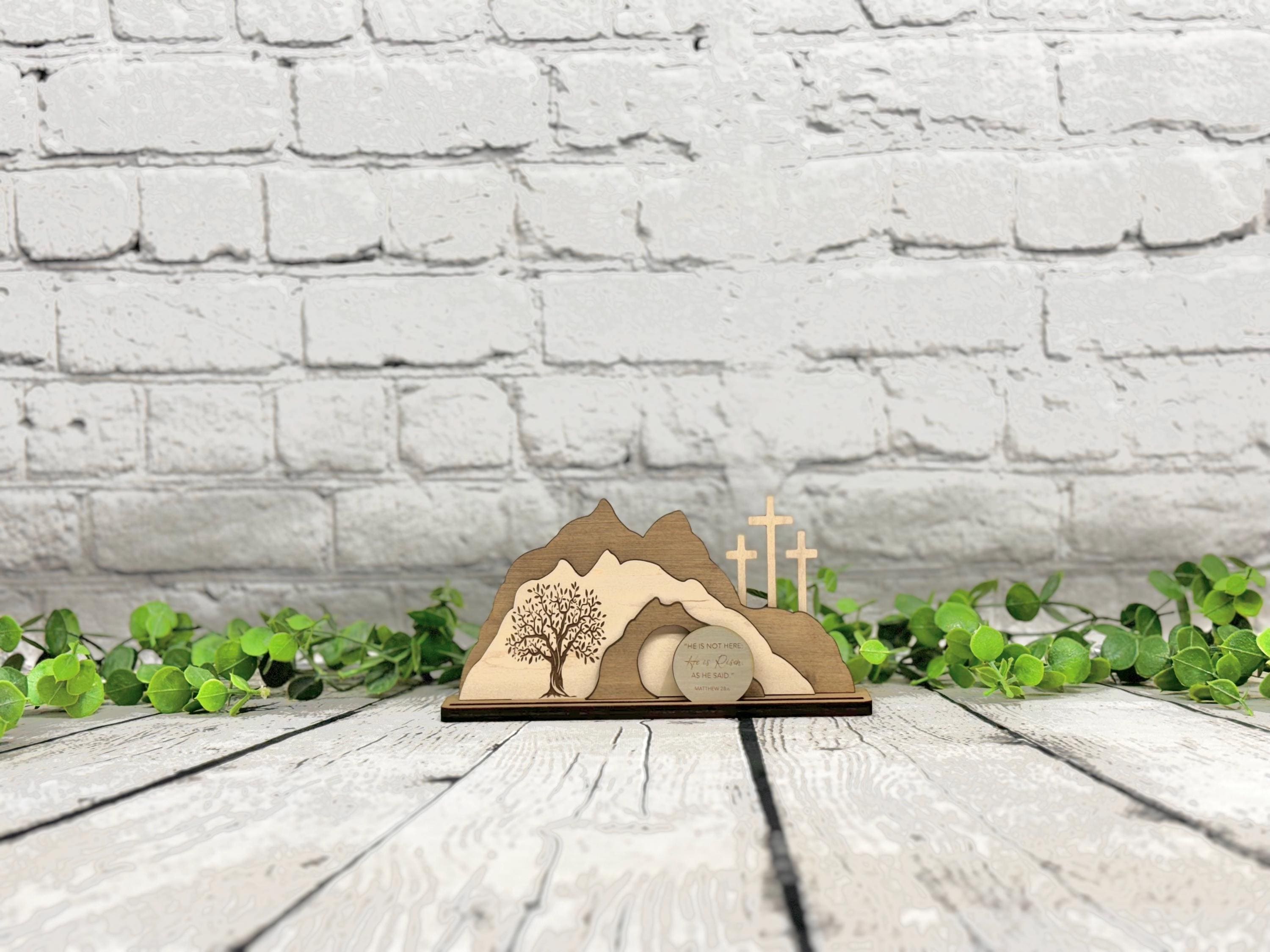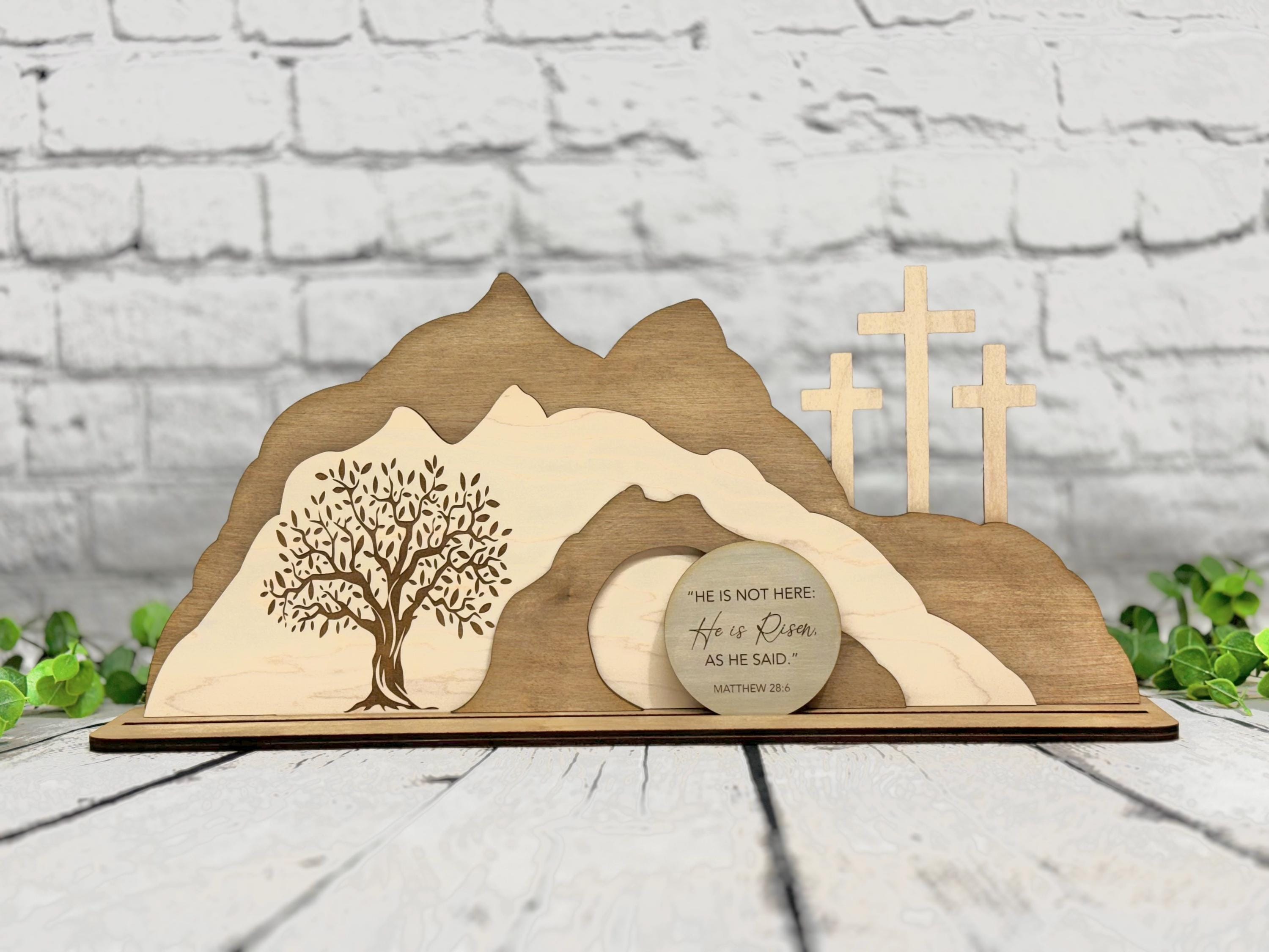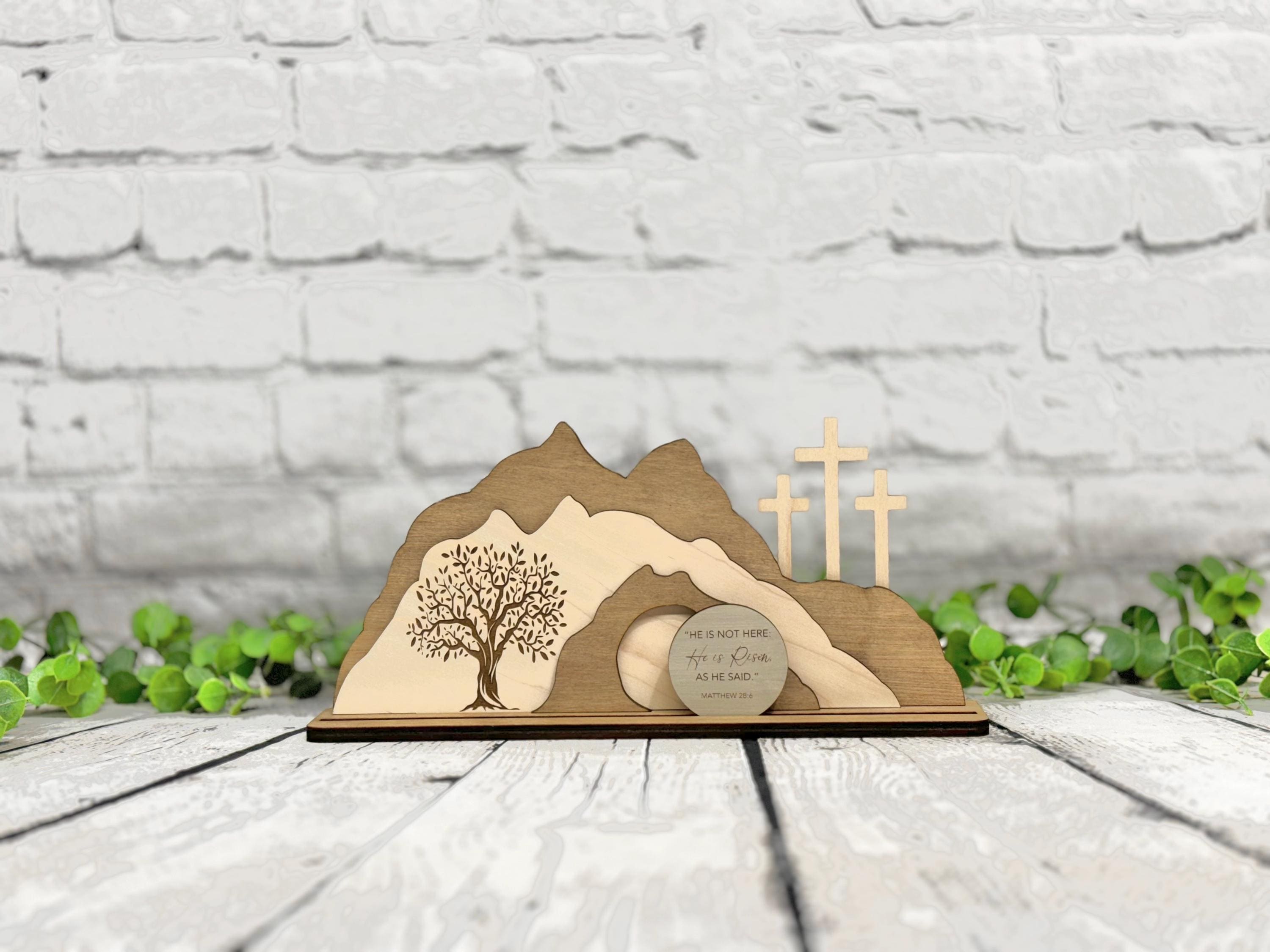 I’m trying to bulk up my Easter decorations and I absolutely love this! My favorite thing about it is that it represents all three parts of Christ’s sacrifice for us - the Garden, the cross, and the empty tomb. The writing on the stone is very crisp and clear, unlike others I’ve seen that kind of bleed into the wood. It’s crafted well, and I appreciate that you can take it apart and store it flat to avoid breaking any parts. It shipped quickly also. I got the medium size and it fit nicely on my mantle. Very happy with it!
