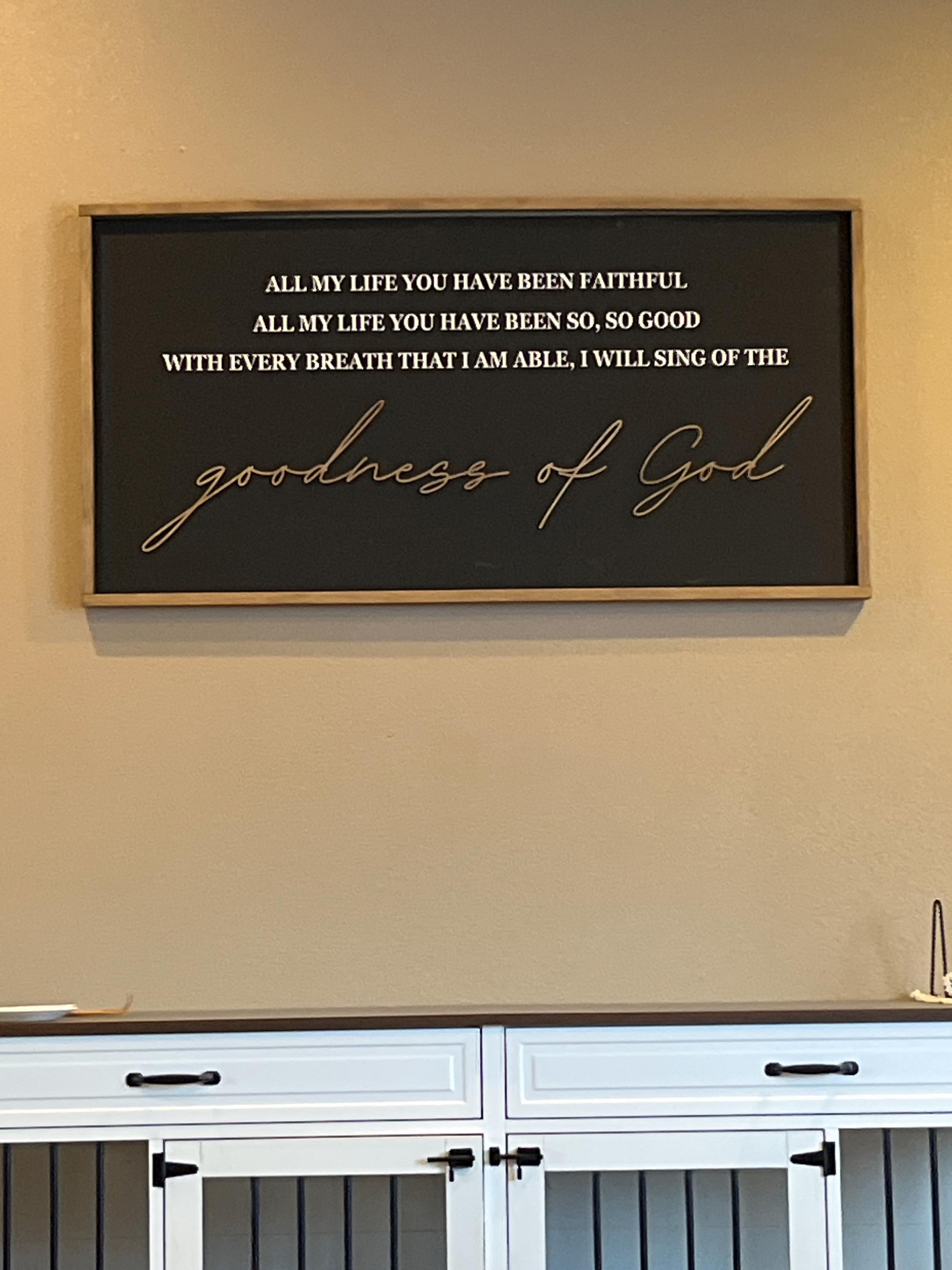 A sign, or should we say a piece of art? This piece has such meaningful words and is the perfect center of attention for yours or anothers Christian home. It is handmade from solid pine wood and features the lyrics from the song "Goodness of God" by Bethel Music and Jenn Johnson. The 3D lettering is more premium, crisp, and adds dimension that will catch the eyes of so many people. It is available to order in two different color options and three different sizes to match and meet your needs! The lettering will be either white or black, coming in the opposite color of the chosen sign color. The main lyrics, "Goodness of God" is a stained wood color that also matches perfectly with the stain color of the frame. The sign features sawtooth hanging bracket(s) on the backside for easy hanging and leveling of the sign. It is designed and made right here in the USA by us at TextOnTimber.