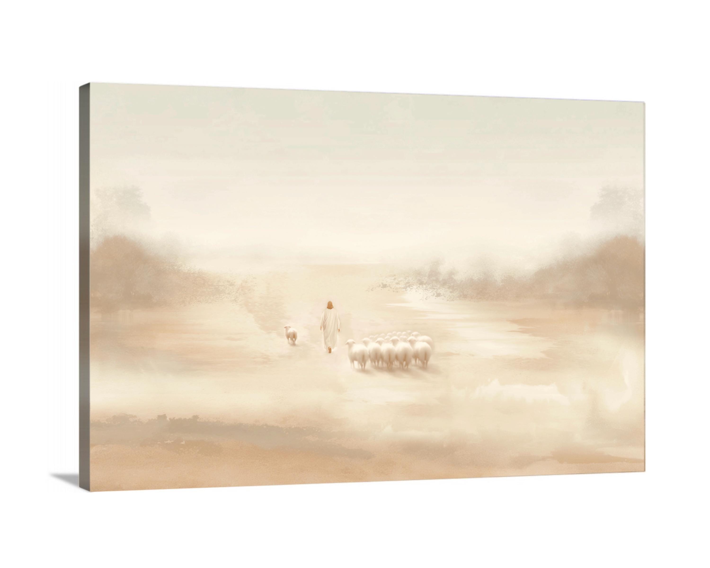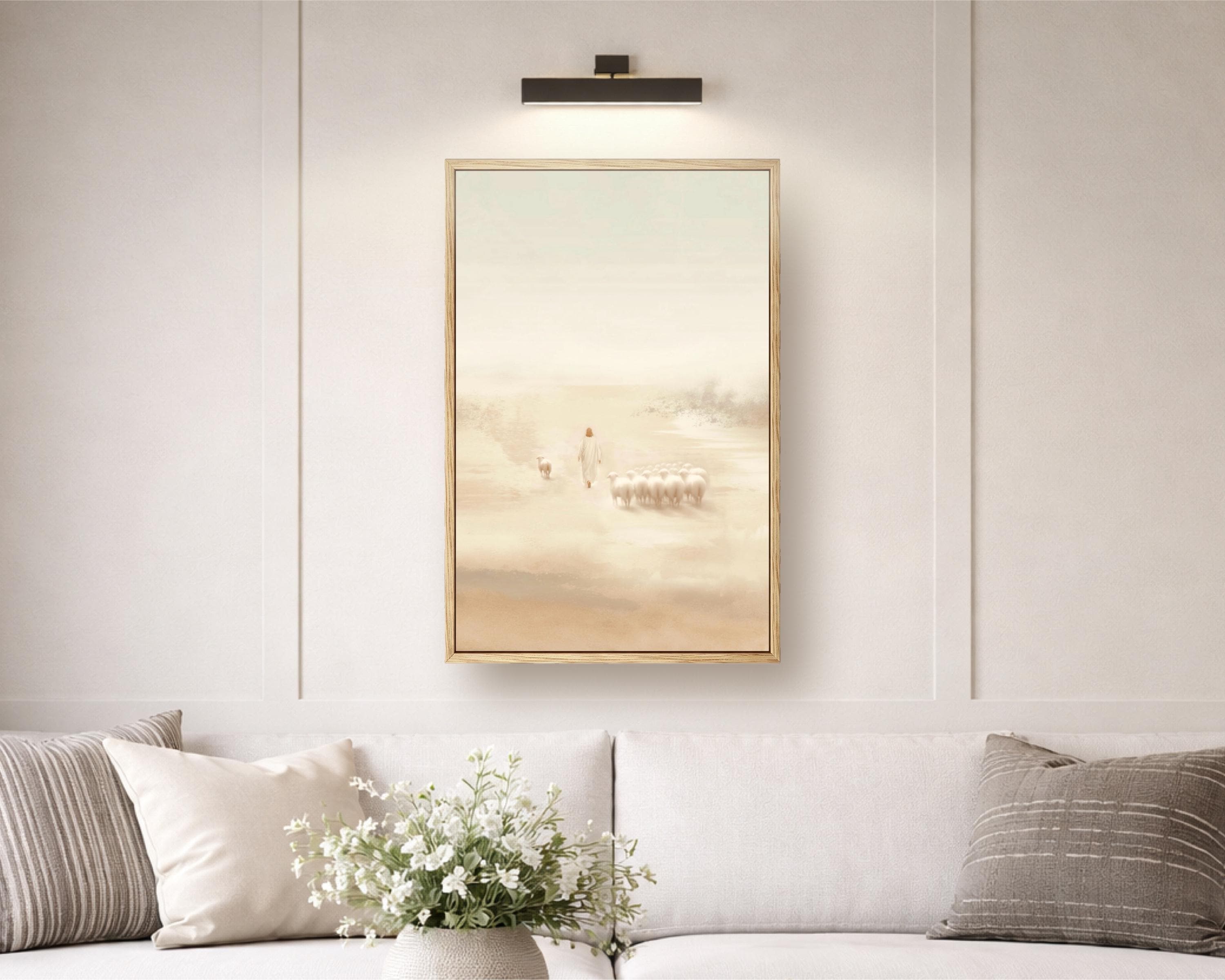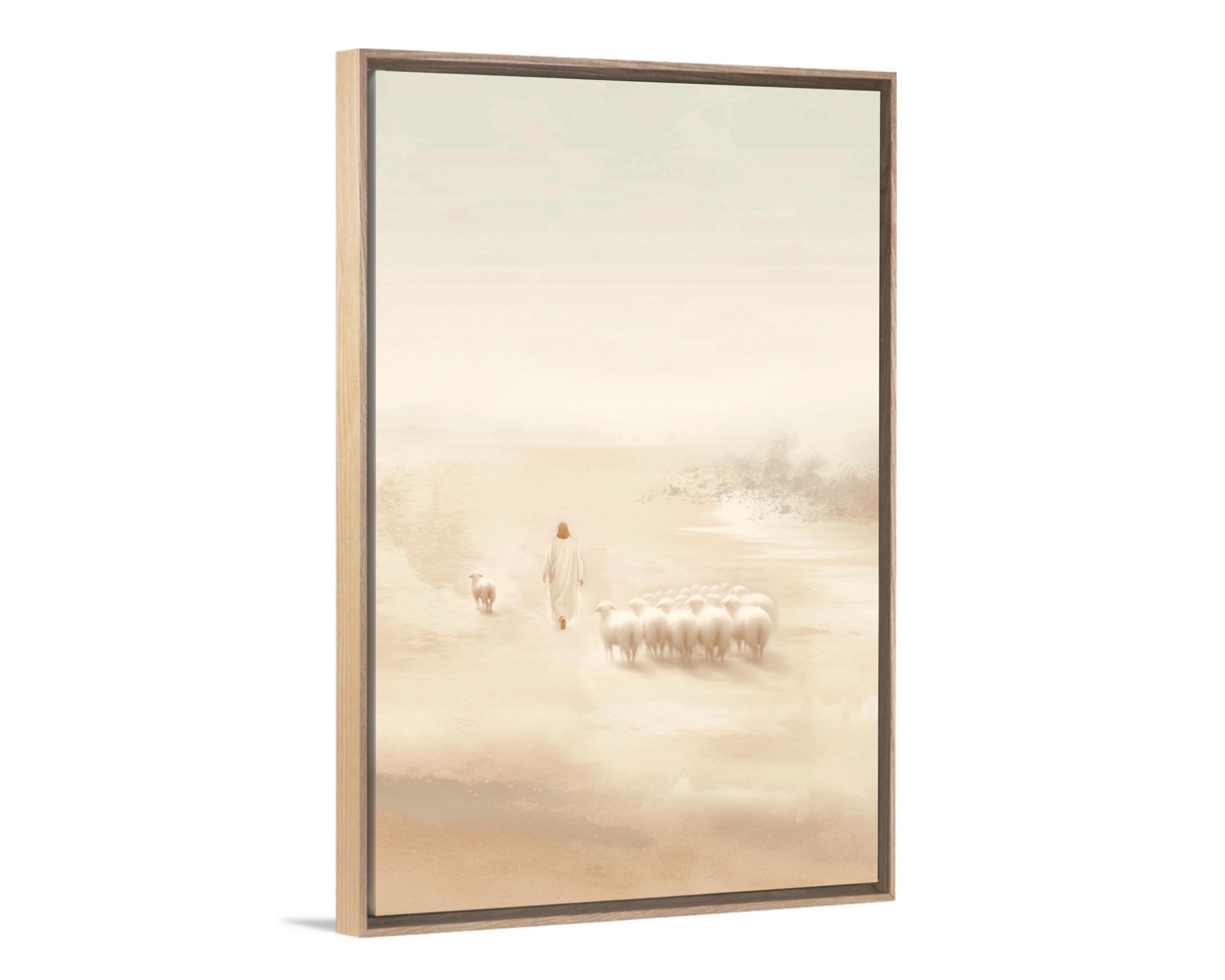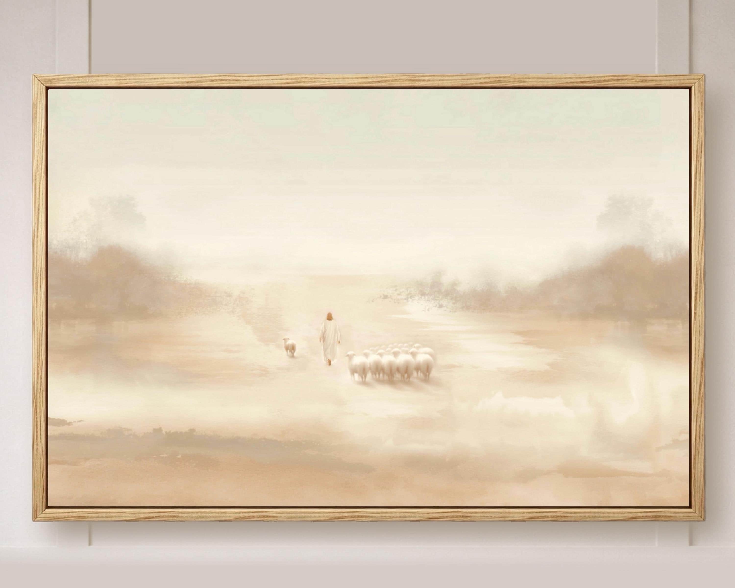 This art piece was created to reflect the radical, selfless love of the Good Shepherd. Jesus doesn’t measure worth by the safety of the crowd — He sees the one wandering and moves toward it with unwavering grace. The modern and minimalistic gentle tones speak of mercy while the distance between Jesus and the single sheep is filled with quiet urgency — a reminder that He always comes for us, even when we’ve drifted. It was created to bring the light of Jesus Christ into your home while also reminding, you are worth the walk, you are worth the search, and you are worth the rescue.