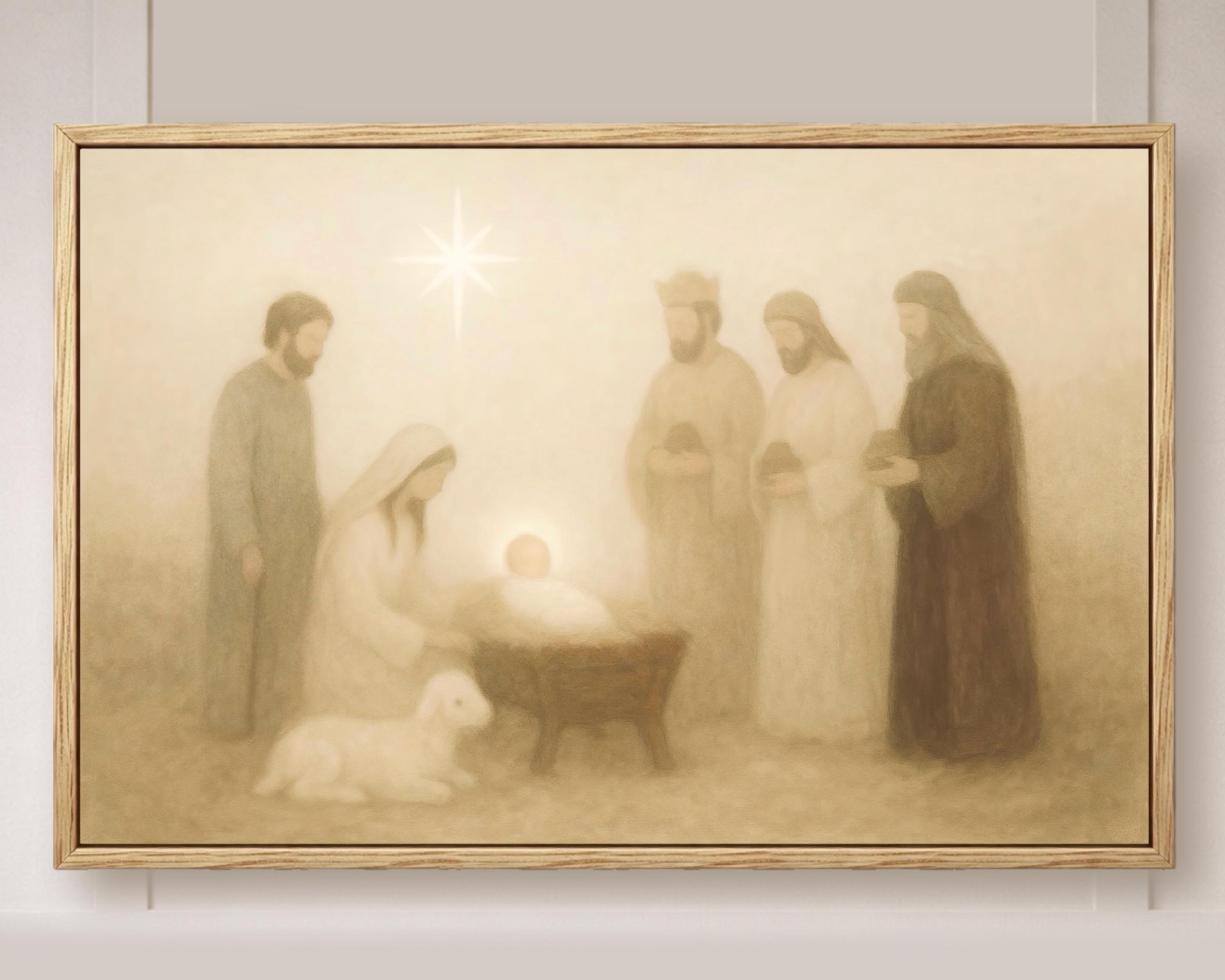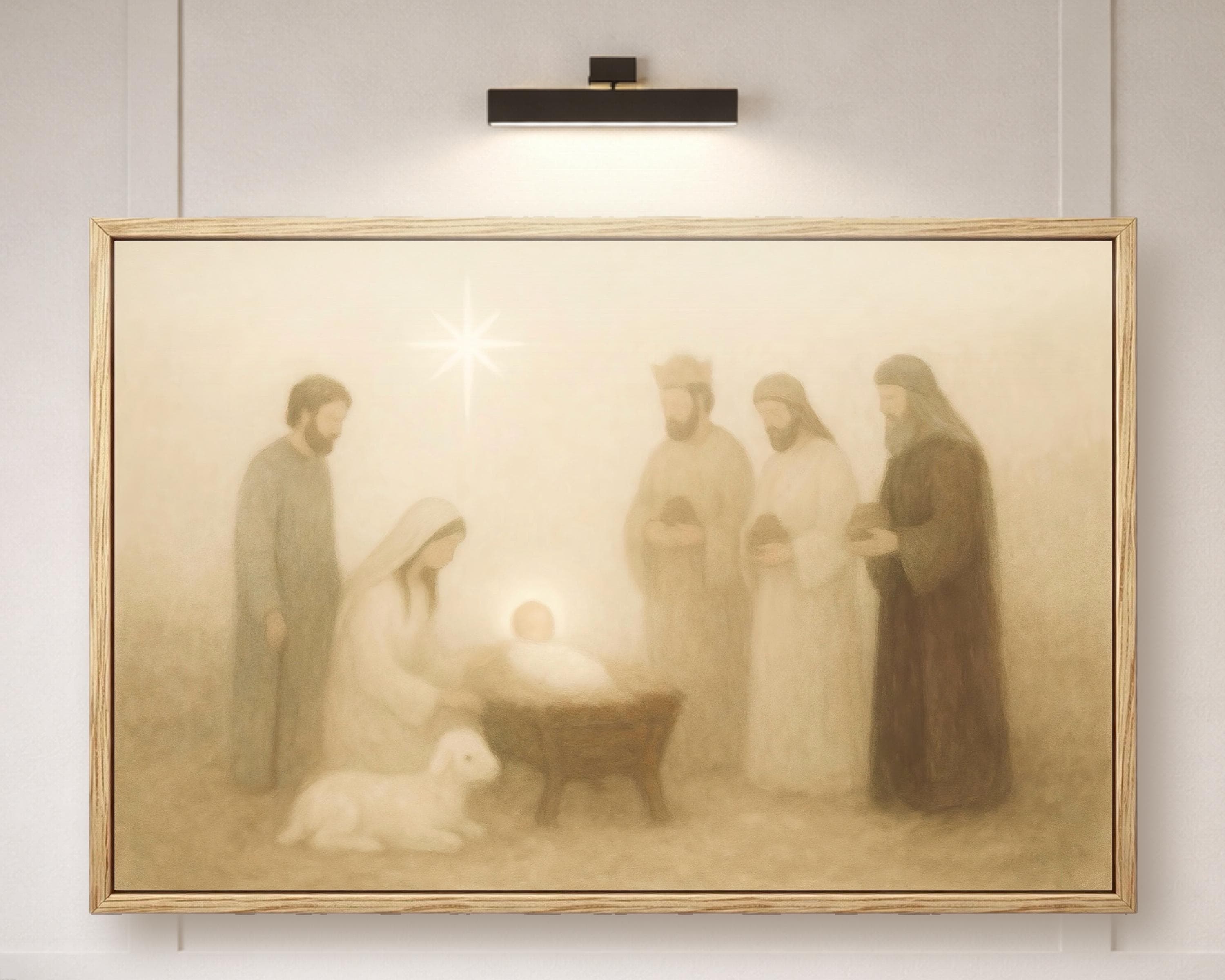 This art piece was created to reflect the holy wonder of Christmas night - when heaven's light broke through the darkness and the long-awaited Savior was born. Silent Night captures that sacred stillness under the glow of one bright star, a moment when angels sang, shepherds knelt, and hope took its first breath. May it fill your home with peace and remind you that the miracle of that night still shines today through Him, the Light of the world.